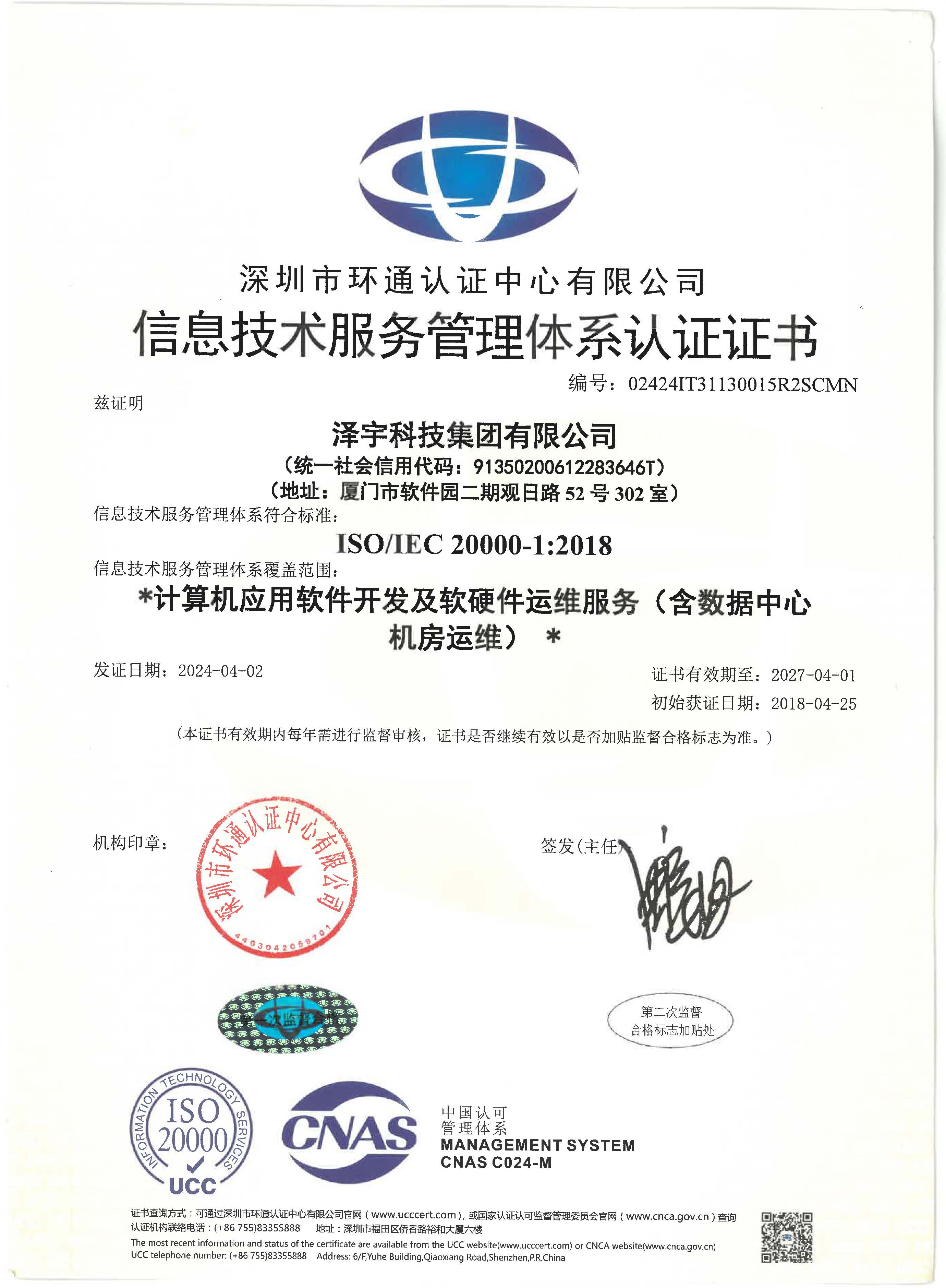 ABOUT US關于我們ABOUT US關于我們澤宇科技集團是一家集物聯網應用、系統集成、軟件開發及運維服務于一體的綜合性、科技型、專業技術服務型企業,同時也是廈門市首家專業從事數據中心建設的企業。 經過二十五年來的實踐和積累,擁有一支集設計咨詢、應用開發、項目實施管理和運維服務的高水平團隊,并取得相關行業、主管部門的認可和認證。 公司深耕數據中心建設及運維近三十年,通過技術積累、不斷創新,擁有兩個發明專利、二十余項實用新型及六十余項軟件著作權。 旗下子公司: 晟科信息技術有限公司 中聯偉業(廈門)科技有限公司 晟科教育裝備(惠安)有限公司 尚校云信息技術泉州有限公司 公司通過對“物聯網管理系統及方法”的專利技術的深度應用,研發了物聯網感知平臺(IOT平臺)及數據中臺,實現數據管理和應用孿生,完成對前端控制設備進行數據清洗及控制反推。 公司通過對“數據中心降溫方法”的專利技術,在數據中心節能方面進行應用和創新,形成了數據中心節能核心技術,取得了綠色數據中心建維5A級認證,并且我們也是綠色數據中心建維體系認證的參編單位。 以上2個核心專利技術的應用,主要在數據中心的安全、節能和便捷管理方向上,同時,我司也對2項專利技術應用方向,進行了深度融合,廣泛應用到智慧園區、智慧工廠、智慧醫療、智慧建筑、智慧農業、智慧校園等業務管理場景。 | NEWS新聞資訊NEWS新聞資訊